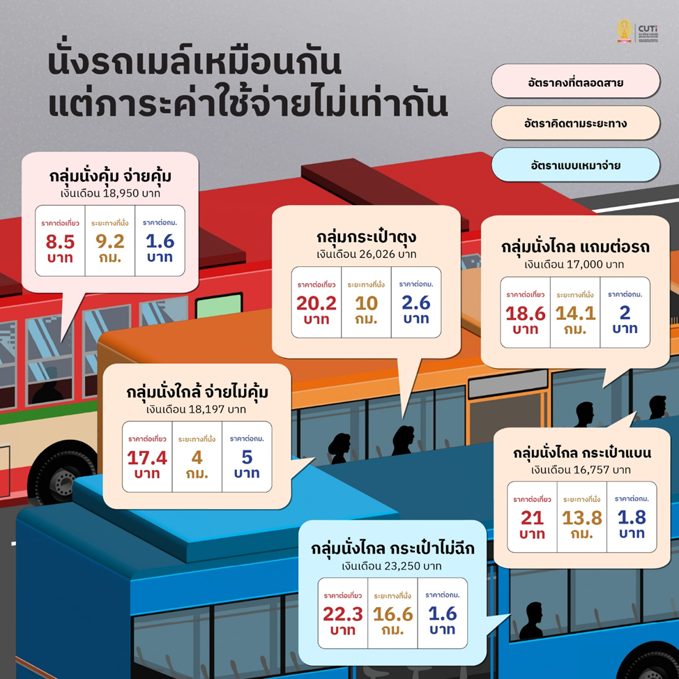 ผลการศึกษาพบว่า โครงสร้างค่าโดยสารกรุงเทพฯ ที่ใช้ทั้งแบบราคาเดียว แบบคิดตามระยะทาง และแบบอัตราเหมาจ่ายรายวันหรือรายเดือน ล้วนสร้างภาระที่แตกต่างกันต่อกลุ่มผู้โดยสาร ระบบแบบราคาเดียว แม้จะช่วยลดภาระให้กับผู้โดยสาร แต่ไม่สะท้อนต้นทุนการเดินทางที่แท้จริง และยังสร้างความไม่เสมอภาคสำหรับผู้เดินทางในระยะทางสั้น ขณะที่ระบบคิดตามระยะทาง แม้จะออกแบบมาเพื่อสะท้อนเดินทางตามระยะทางจริง แต่กลับเป็นภาระหนักสำหรับผู้มีรายได้น้อยที่ต้องเดินทางจากชานเมืองเข้าสู่ใจกลางเมือง อีกทั้งยังต้องแบกรับค่าโดยสารเริ่มต้นที่สูงและการปรับราคาแบบก้าวกระโดด ทำให้ค่าโดยสารคิดเป็นสัดส่วนสูงเมื่อเทียบกับรายได้ ส่วนระบบอัตราเหมาจ่ายรายวันหรือรายเดือนที่ควรเป็นหลักประกันค่าใช้จ่าย กลับเอื้อประโยชน์ต่อผู้ที่เดินทางเป็นประจำมากกว่าผู้มีรายได้น้อยที่ไม่ได้ใช้บริการทุกวัน และยังมีราคาสูงเกินกว่าที่ผู้มีรายได้น้อยจะเข้าถึงได้ อีกทั้งยังพบว่ากลุ่มคนเดินทางรายได้น้อยจำนวนไม่น้อยต้องจ่ายค่าการเข้าถึงระบบเพิ่มเติม เช่น มอเตอร์ไซค์รับจ้าง เพื่อไปถึงป้ายรถเมล์ ทำให้ต้นทุนการเดินทางยิ่งสูงขึ้น