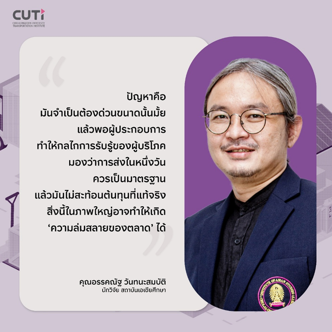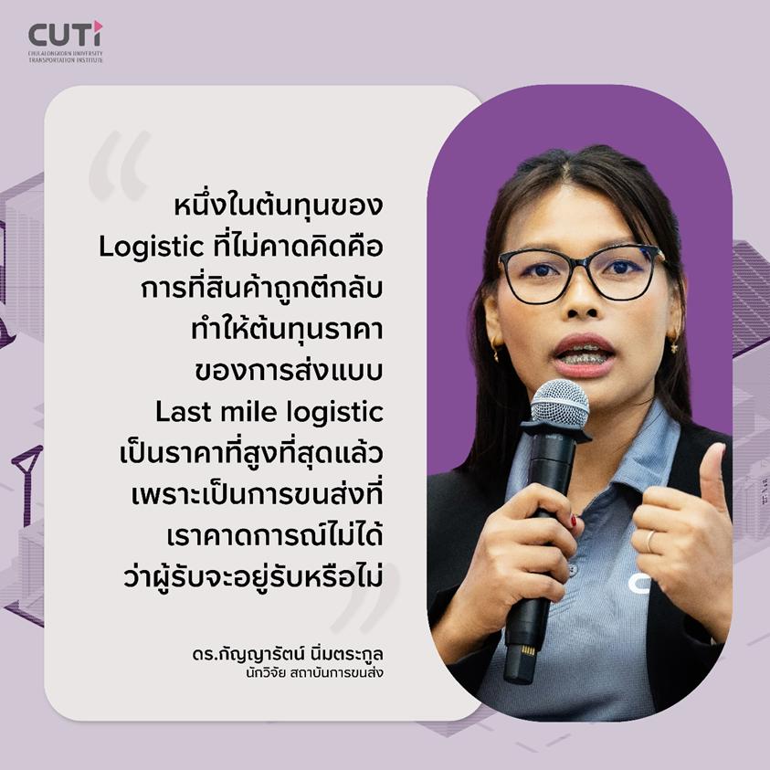ดร.กัญญารัตน์ นิ่มตระกูล นักวิจัยจากสถาบันการขนส่ง ชี้ว่าการให้บริการขนส่งภายในวันเดียว คือการแข่งขันกับเวลา ที่ไม่เพียงทำให้ธุรกิจต้องเร่งประสานงานตลอดห่วงโซ่อุปทาน ตั้งแต่ต้นน้ำถึงปลายน้ำ แต่ยังสร้างต้นทุนแฝงที่มักถูกมองข้าม โดยเฉพาะกรณีพัสดุที่ส่งไม่ถึงมือผู้รับและต้องตีกลับ ซึ่งสะท้อนภาระที่กดดันผู้ประกอบการมากขึ้นเรื่อยๆ แม้จะไม่ใช่ต้นทุนที่ใหญ่ที่สุด แต่ก็เป็นภาระที่หลีกเลี่ยงได้ยากและมีผลต่อความยั่งยืนของธุรกิจในระยะยาว