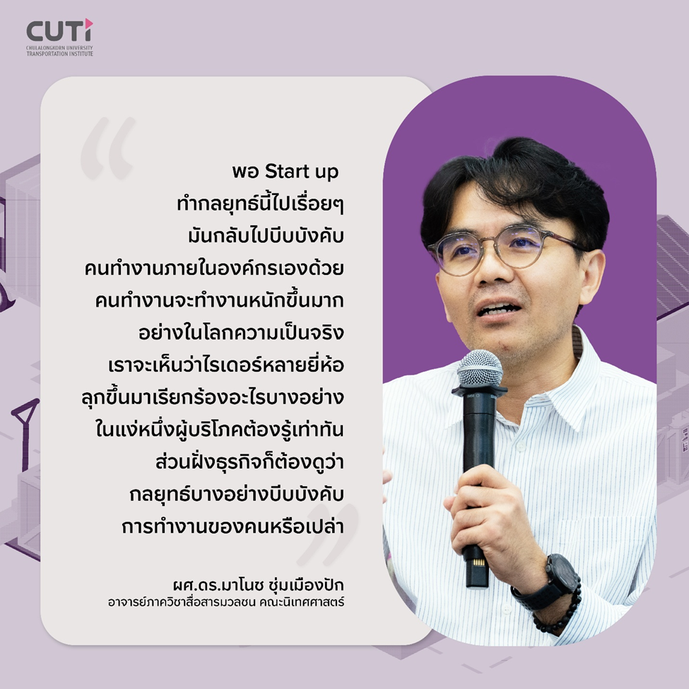 เวทีเสวนาหยิบประเด็นจากซีรีส์ “Mad Unicorn สงครามส่งด่วน” สะท้อนการปรับตัวของผู้ประกอบการขนส่งสินค้าแบบ last-mile delivery ผ่านกลยุทธ์การแข่งขันทางธุรกิจ ด้วยการเพิ่มมูลค่าการให้บริการลูกค้าคนสุดท้าย ให้ได้รับสินค้าภายใน 1 วัน หรือการออกโปรโมชั่นค่าขนส่ง 0 บาท การเสวนาชี้ไปที่ระบบ Same-day delivery หรือการส่งสินค้าภายในวันเดียว ซึ่งแม้จะตอบโจทย์ความสะดวกสบายของผู้บริโภค แต่กลยุทธ์ดังกล่าวกลับสร้างผลกระทบหลายมิติ อาทิ ด้านการตลาดส่งผลให้ผู้บริโภคมีการรับรู้และเคยชินกับการตลาดที่เอื้ออำนวยความสะดวกสบายเกินความจำเป็น ด้านแรงงานได้รับการผลักภาระและความเสี่ยง ทั้งค่าใช้จ่ายส่วนเกิน ชั่วโมงการทำงานที่ยาวนาน และความเสี่ยงต่อสุขภาพและอุบัติเหตุมากขึ้น แรงงานกลับต้องรับความเสี่ยงเหล่านี้ไว้เอง จนกระทบความไม่มั่นคงและความเปราะบางในระยะยาว ด้านสังคมจากการเกิดปัญหารถติดที่รุนแรงขึ้น การเพิ่มขึ้นของการเกิดอุบัติเหตุบนท้องถนน