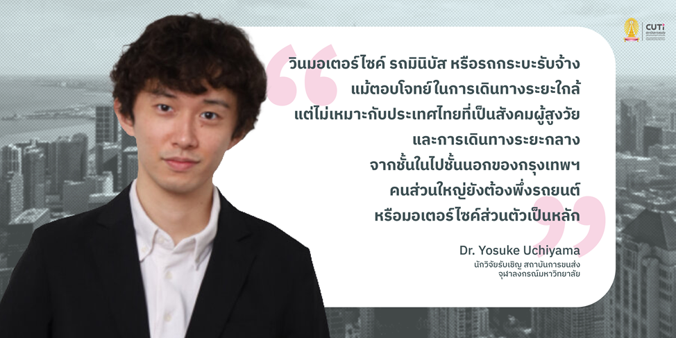 Dr. Yosuke Uchiyama ชี้ว่า ประเทศไทยกำลังเผชิญสถานการณ์คล้ายคลึงกัน ทั้งการเข้าสู่สังคมสูงวัยและความเหลื่อมล้ำในการเข้าถึงระบบขนส่ง โดยเฉพาะในชนบทและชานเมืองที่ต้องพึ่งพารถยนต์ส่วนตัว ขณะที่ระบบในเมืองใหญ่อย่างกรุงเทพฯ แม้มีบริการวินมอเตอร์ไซค์ แต่ยังไม่ครอบคลุมและไม่เหมาะสำหรับการเดินทางระยะไกล เช่น ไปโรงพยาบาล